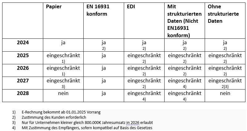 dürfen für in 2025 und 2026 ausgeführte B2B-Umsätze weiterhin Papierrechnungen übermittelt werden. Auch elektronische Rechnungen, die nicht dem neuen Format entsprechen, bleiben in diesem Zeitraum zulässig, allerdings ist hierfür (wie bisher) die Zustimmung des Rechnungsempfängers erforderlich (§ 27 Abs. 38 Nr. 1 UStG n. F.).