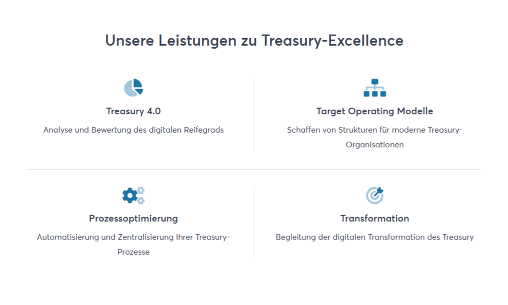 Mit unserer umfassenden Erfahrung aus zahlreichen Finanz- und Treasury-Transformationsprojekten bieten wir weit mehr als klassische Treasury-Beratung. Unser thematischer Fokus und ganzheitlicher Ansatz machen uns zum verlässlichen Partner für Ihre Treasury-Transformation.