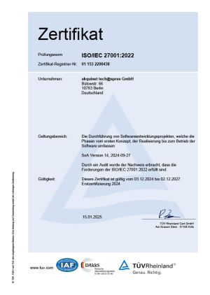 Einige unserer Zertifikate sind noch auf die akquinet AG ausgestellt. Durch unsere Umwandlung von einer AG in eine GmbH per 9. August 2022 gehen diese Zertifikate automatisch auf die akquinet GmbH über.